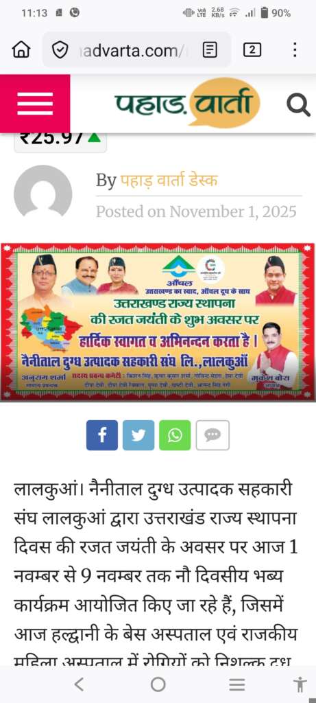 लालकु कुआं: [सराहनीय] नैनीताल दुग्ध उत्पादक सहकारी संघ लालकुआं द्वारा आज से 9 नवम्बर तक नौ दिवसीय भब्य कार्यक्रम आयोजित किए जा रहे हैं, आज हल्द्वानी के बेस अस्पताल एवं राजकीय महिला अस्पताल में रोगियों को निशुल्क दूध वितरण शुरू कर किया गया है! मुकेश बोरा अध्यक्ष ✍️ Ashok Gulati editor in chief नैनीताल दुग्ध उत्पादक सहकारी संघ लालकुआं द्वारा उत्तराखंड राज्य स्थापना दिवस की रजत जयंती के अवसर पर आज 1 नवम्बर से 9 नवम्बर तक नौ दिवसीय भब्य कार्यक्रम आयोजित किए जा रहे हैं, जिसमें आज हल्द्वानी के बेस अस्पताल एवं राजकीय महिला अस्पताल में रोगियों को निशुल्क दूध वितरण शुरू कर दिया गया है तथा लालकुआं दुग्ध संघ प्रांगण में निशुल्क स्वास्थ्य शिविर, दुग्धशाला में स्कूली बच्चों का भ्रमण कार्यक्रम एवं भव्य संगोष्ठी का आयोजन किया जा रहा है।