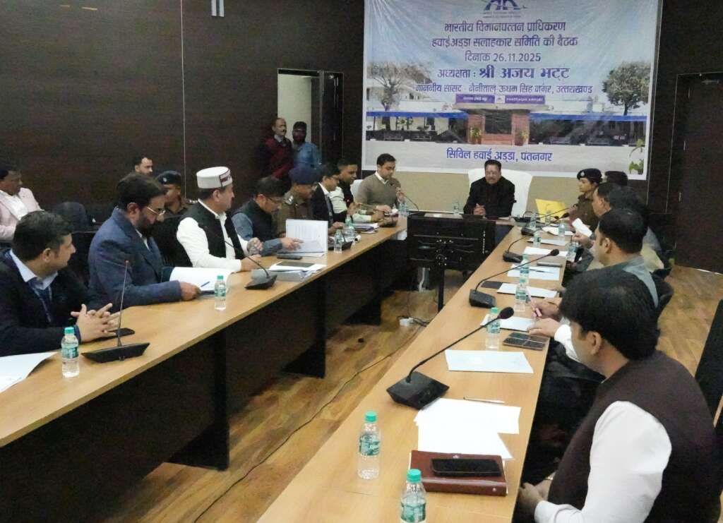 रूद्रपुर: . सांसद एवं अध्यक्ष भारतीय विमानपत्तन हवाई अड्डा सलाहकार समिति पंतनगर अजय भट्ट की अध्यक्षता में भारतीय विमानपत्तन हवाई अड्डा सलाहकार समिति की बैठक जिला सभागार में आयोजित हुई।