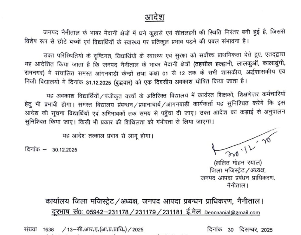 जिला मजिस्ट्रेट एवं अध्यक्ष, जनपद आपदा प्रबंधन प्राधिकरण, नैनीताल द्वारा जारी आदेश के अनुसार तहसील हल्द्वानी, लालकुआँ, कालाढूंगी एवं रामनगर क्षेत्र में संचालित समस्त आंगनबाड़ी केंद्रों तथा कक्षा 01 से 12 तक के सभी शासकीय, अशासकीय एवं निजी विद्यालयों में दिनांक 31 दिसंबर 2025 (बुधवार) को अवकाश रहेगा।