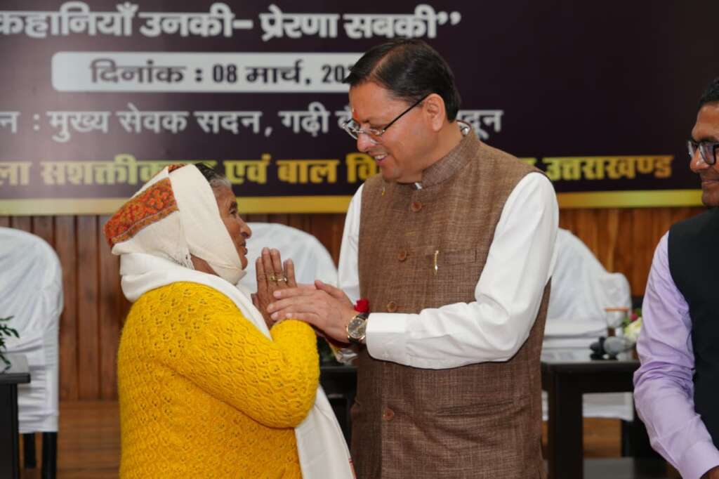 मुख्यमंत्री पुष्कर सिंह धामी ने रविवार को मुख्य सेवक सदन, देहरादून में अंतर्राष्ट्रीय महिला दिवस के अवसर पर वरिष्ठ मातृशक्ति का सम्मान ‘‘नारी तू नारायणी’’ कार्यक्रम में प्रतिभाग किया। इस दौरान मुख्यमंत्री ने शिक्षा, समाज सेवा, उद्यमिता, पर्यावरण संरक्षण, कृषि, संस्कृति, जल संरक्षण जैसे विभिन्न क्षेत्रों में सर्वश्रेष्ठ कार्य करने वाली राज्यभर से 38 वरिष्ठ महिलाओं को सम्मानित किया।