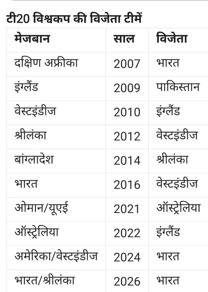 टी20 विश्व कप के इतिहास में भारत ने सबसे ज्यादा तीन और वेस्टइंडीज और इंग्लैंड ने दो-दो बार खिताब जीता है। भारत ने भी 2007, 2024 और 2026 में ट्रॉफी अपने नाम की है। वहीं, इंग्लैंड ने 2010 और 2022 में ट्रॉफी जीती। वेस्टइंडीज ने 2012 और 2016 में खिताब जीता था। इसके अलावा पाकिस्तान, ऑस्ट्रेलिया और श्रीलंका एक-एक बार चैंपियन बन चुके हैं। भारत की जीत खुशी पूरे भारत में जबरदस्त जश्न मनाया जा रहा है l प्रधानमंत्री सहित विभिन्न नेताओं ने टीम को बधाई दी है l