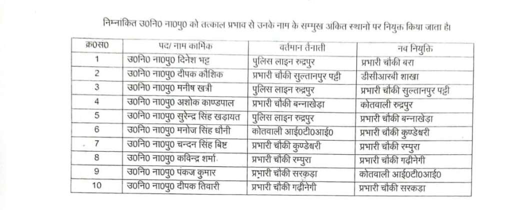 ब्रेकिंग रुद्रपुर:एसएसपी ऊधम सिंह नगर अजय गणपति द्वारा निम्न उपनिरीक्षकों के किए गए स्थानांतरण!✍️ Ashok gulati एडिटर इन चीफ