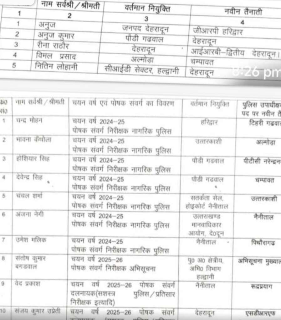 चन्द्र मोहन, टिहरी गढवाल,श्रीमती भावना कैंथोला, अल्मोड़ा, ,होशियार सिह, पीटीसी नरेन्द्रनगर,देवेन्द्र सिह, चम्पावत,,चंचल शर्मा, उत्तरकाशी,श्रीमती अंजना नेगी नैनीताल,उमेश मलिक पिथौरागढ,संतोष कुमार बगडवाल अभिसूचना मुख्यालय,वेद प्रकाश, रूद्रप्रयाग,संजय कुमार उप्रेती,एसडीआरएफl इधर दूसरीपुलिस महानिदेशक दीपम सेठ द्वारा सभी पदोन्नत अधिकारियों को हार्दिक बधाई देते हुए उनके उज्जवल भविष्य की कामना की हैl इधर पुलिस मुख्यालय द्वारा निम्नलिखित पुलिस उपाधीक्षकों को जनहित/रिक्ति के सापेक्ष उनकी वर्तमान तैनाती से उनके नाम के सम्मुख अंकित नवीन तैनाती पर तत्काल प्रभाव से स्थानान्तरित किया जाता है:-
