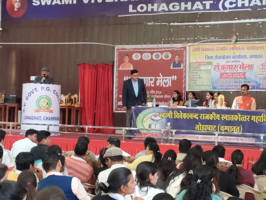 लोहाघाट :जिलाधिकारी मनीष कुमार के निर्देशानुसार कौशल विकास एवं सेवायोजन विभाग, चम्पावत द्वारा स्वामी विवेकानंद राजकीय स्नातकोत्तर महाविद्यालय, लोहाघाट में एक दिवसीय रोजगार मेले का आयोजन किया गया। कार्यक्रम का शुभारंभ नगर पालिका अध्यक्ष श्री गोविन्द वर्मा द्वारा माँ सरस्वती के समक्ष दीप प्रज्ज्वलित कर किया गया।