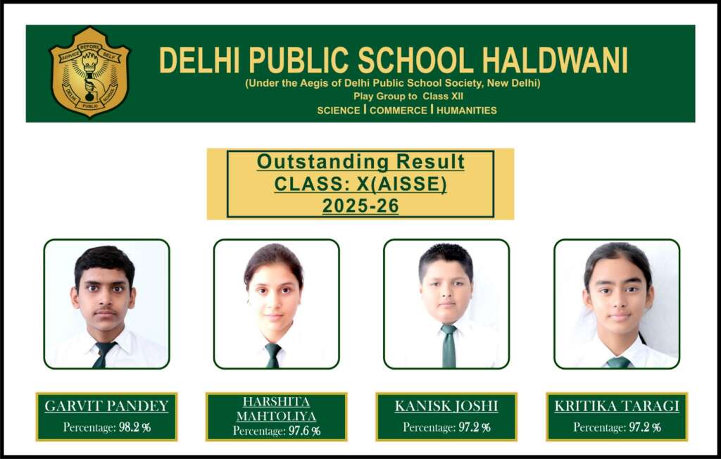 हल्द्वानी। केंद्रीय माध्यमिक शिक्षा बोर्ड (CBSE) द्वारा घोषित कक्षा 10 के परीक्षा परिणाम में दिल्ली पब्लिक स्कूल, हल्द्वानी के विद्यार्थियों ने शानदार प्रदर्शन करते हुए विद्यालय का नाम रोशन किया है। इस वर्ष विद्यालय का परिणाम अत्यंत उत्कृष्ट रहा और विद्यार्थियों ने उच्च प्रतिशत अंक प्राप्त कर अपनी प्रतिभा का परिचय दिया।