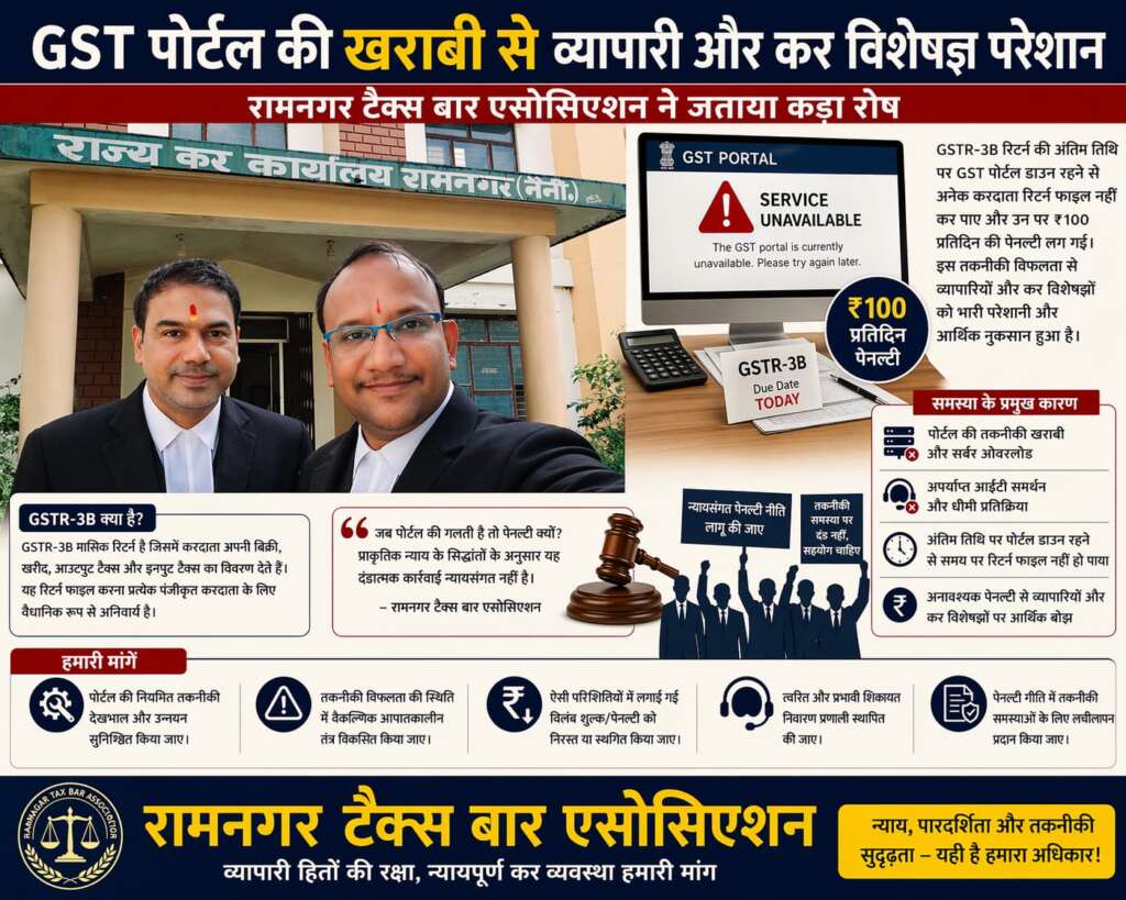 रामनगर: जीएसटी (Goods and Services Tax) पोर्टल की बार-बार हो रही खराबी ने देश के व्यापारी और कर विशेषज्ञों के लिए चिंता का माहौल बना दिया है। खासकर आज, जब GSTR-3B रिटर्न की अंतिम तारीख थी, पोर्टल डाउन होने के कारण कई व्यवसायियों को रिटर्न फाइल करने में समस्या हुई और 100 रुपये प्रतिदिन की पेनल्टी का सामना करना पड़ा।GSTR-3B मासिक रिटर्न है, जिसमें करदाता अपनी बिक्री, खरीद और कर देनदारी का विवरण देते हैं। यह रिटर्न फाइल करना व्यापारियों के लिए अनिवार्य है। लेकिन पोर्टल डाउन होने से कई व्यवसायी समय पर रिटर्न फाइल नहीं कर पाए, जिससे उन्हें अनावश्यक आर्थिक बोझ उठाना पड़ा।GSTR-3B मासिक रिटर्न है, जिसमें करदाता अपनी बिक्री, खरीद और कर देनदारी का विवरण देते हैं। यह रिटर्न फाइल करना व्यापारियों के लिए अनिवार्य है। लेकिन पोर्टल डाउन होने से कई व्यवसायी समय पर रिटर्न फाइल नहीं कर पाए, जिससे उन्हें अनावश्यक आर्थिक बोझ उठाना पड़ा।रामनगर टैक्स बार एसोसिएशन के अध्यक्ष, एडवोकेट पूरन चंद्र पांडे और संयुक्त सचिव, एडवोकेट मनु अग्रवाल ने इस मुद्दे पर कड़ा रोष व्यक्त किया। उन्होंने कहा कि केवल एक दिन की पोर्टल खराबी से ही व्यवसायियों पर भारी पेनल्टी लग रही है, जो असंगत और अनुचित है। उन्होंने सरकार से मांग की कि पोर्टल की नियमित देखभाल और आपातकालीन योजना सुनिश्चित की जाए, ताकि व्यवसायियों को इस तरह के अनावश्यक वित्तीय बोझ से बचाया जा सके।उन्होंने आगे कहा कि पेनल्टी प्रणाली में तकनीकी समस्याओं के कारण लचीलापन होना चाहिए और GST पोर्टल की विश्वसनीयता और उपयोगकर्ता सहायता पर विशेष ध्यान दिया जाना चाहिए। कर विशेषज्ञ और टैक्स एडवोकेट भी इस स्थिति से प्रभावित हुए हैं। वे अपने ग्राहकों के रिटर्न समय पर फाइल कराने और पेनल्टी से बचाने के लिए लगातार प्रयासरत हैं, लेकिन पोर्टल की तकनीकी खराबी, सर्वर ओवरलोड और अपर्याप्त IT समर्थन उनकी जिम्मेदारियों को चुनौतीपूर्ण बना रहा है।विशेषज्ञों का कहना है कि डिजिटल कर अनुपालन प्रणाली में निरंतर तकनीकी सुधार, पारदर्शी पेनल्टी नीति और त्वरित शिकायत निवारण प्रणाली बेहद आवश्यक है। इससे व्यापारी और कर विशेषज्ञ दोनों बिना अतिरिक्त तनाव के नियमों का पालन कर सकेंगे।